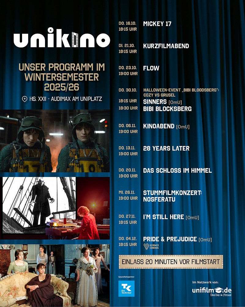 Filmvorführungen in der Vorlesungszeit jeden Donnerstag ab 19 Uhr (bei Überlänge 18:15 Uhr) im Audimax.